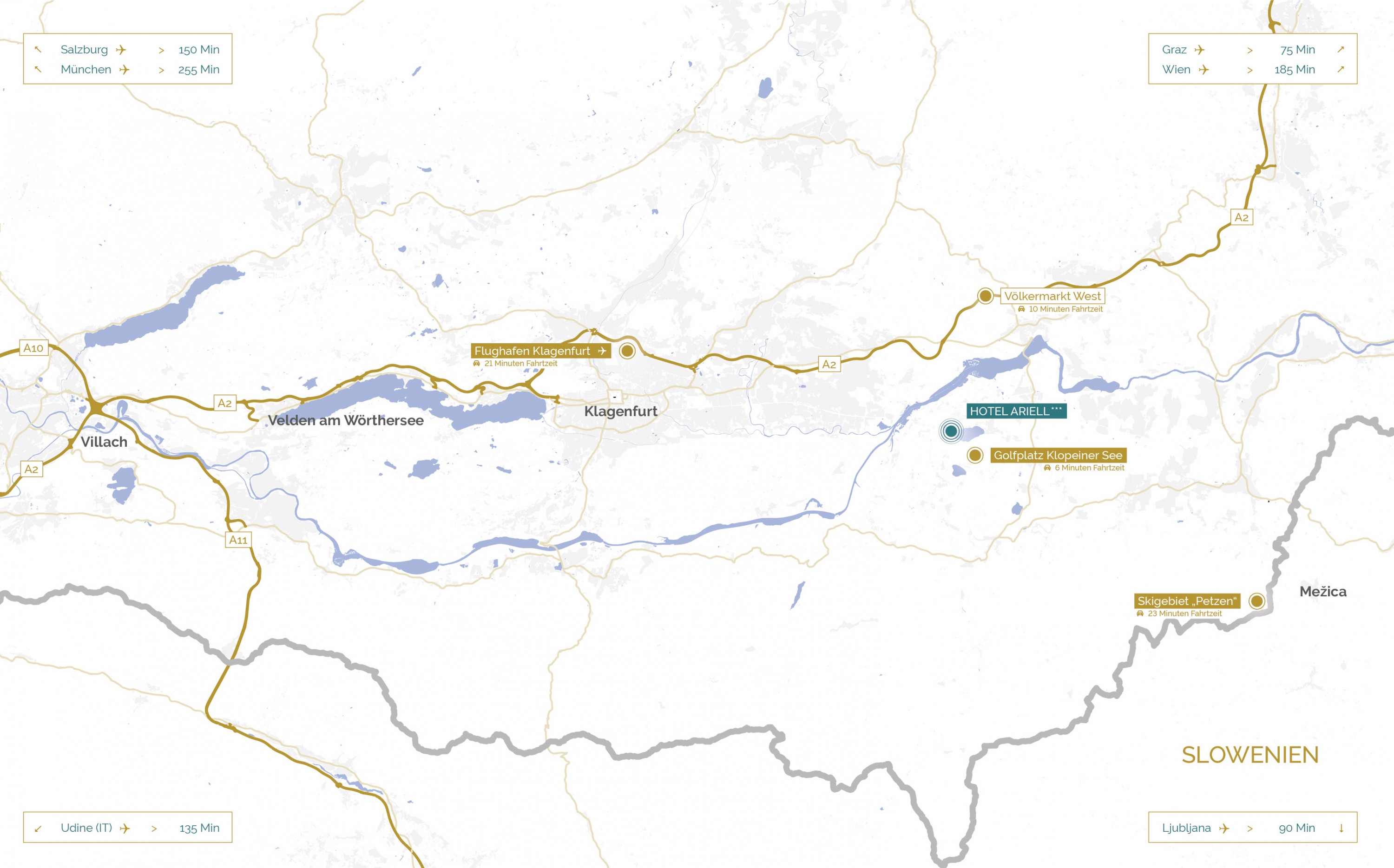Das Hotel befindet sich in einer Bestlage inmitten der Tourismusregion St. Kanzian, nur 270 Meter Luftlinie vom Klopeiner See entfernt. Der nächste öffentliche Seezugang ist durch einen kurzen Spaziergang über die sehenswerte Promenade des Klopeiner Sees vom Hotel aus erreichbar. Kooperationen mit den zahlreichen öffentlichen Strandbädern bezüglich einer günstigen Mitbenützung für Hotelgäste sind jederzeit möglich. Viele beliebte Sehenswürdigkeiten der Region sind aufgrund der zentralen Lage nahe.